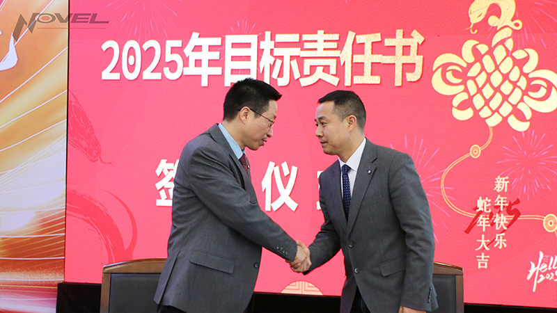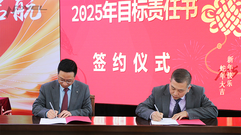 潘健總經理與子公司總經理、總部職能部門負責人簽訂2025年目標責任書。新的一年,全體管理人員一致向前,緊盯全年目標任務,堅定落實發展舉措,必將帶領各部協同、高效發展。廣州永新副總經理吳箭宇代表發言。